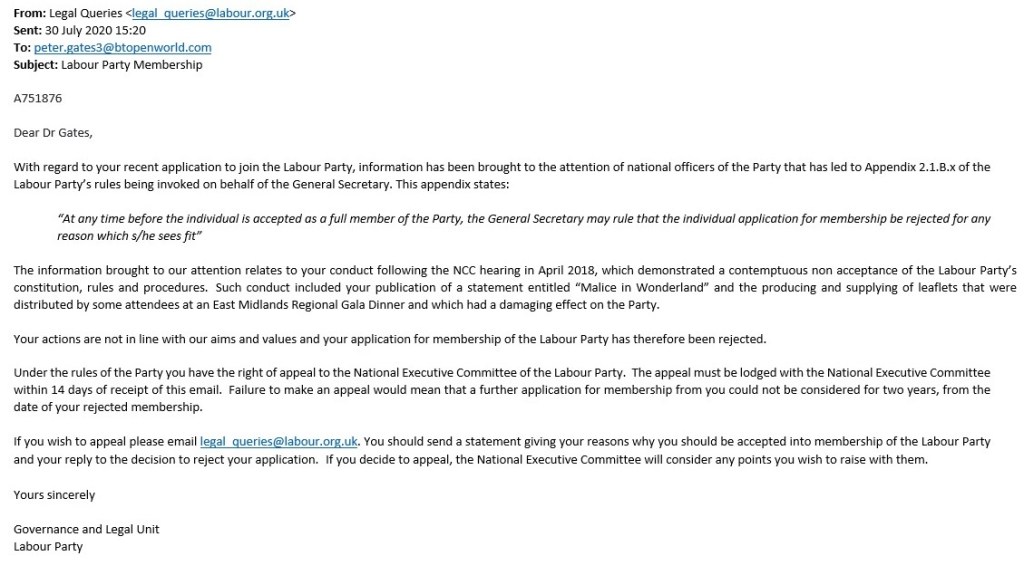 Two years after being excluded for two years, I decided to re-apply to join the Party. I applied to rejoin the Party on 20 June 2020 and with my application included letters of support from: Rushcliffe CLP Chair, the Leader of the Labour Group on Rushcliffe Borough Council, Rushcliffe PPC in the 2017 and 2019 General Elections, a previous Chair of West Bridgford Branch, and a previous BAME coordinator. After a couple of weeks I received a letter welcoming me back to the Labour Party. However shortly after, I received the email below from the Legal and Governance Unit informing me that because I had disagreed with the decision to exclude me, and continued to argue my innocence, I had “demonstrated a contemptuous non acceptance of the Labour Party’s constitution, rules and procedures.” Furthermore, in making people aware of the case by presenting evidence I had “a damaging effect on the Party“.